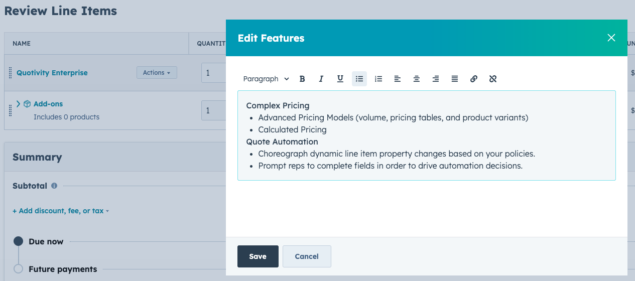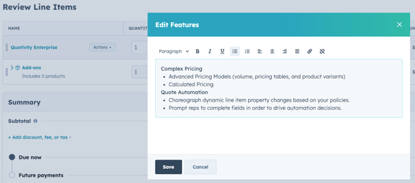If you need to edit the Product Description or Product Features line item properties, just click and it'll open a large editor to make the job easy.
