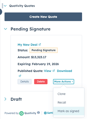 You can now "Mark as Signed" any Published quote (with space for a written signature) and we'll update the signing status on the quote and copy those line items to the deal.